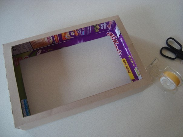 В коробке от хлопьев вырежьте 2 окна в широких сторонах, оставив рамки шириной 2 см.