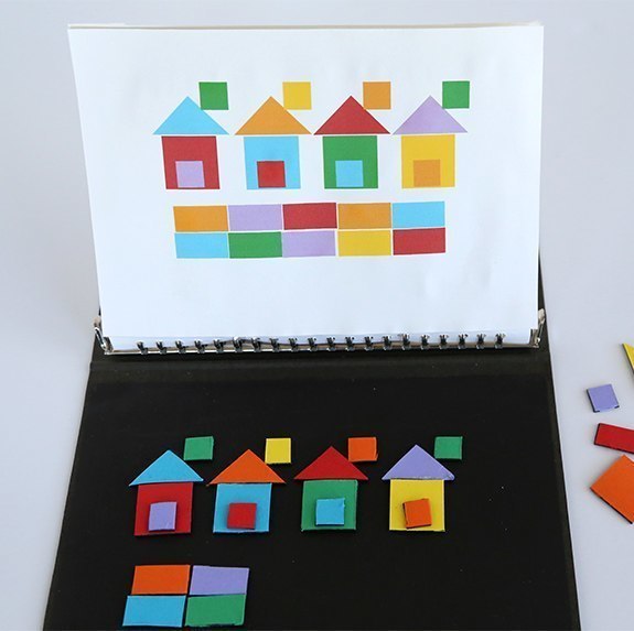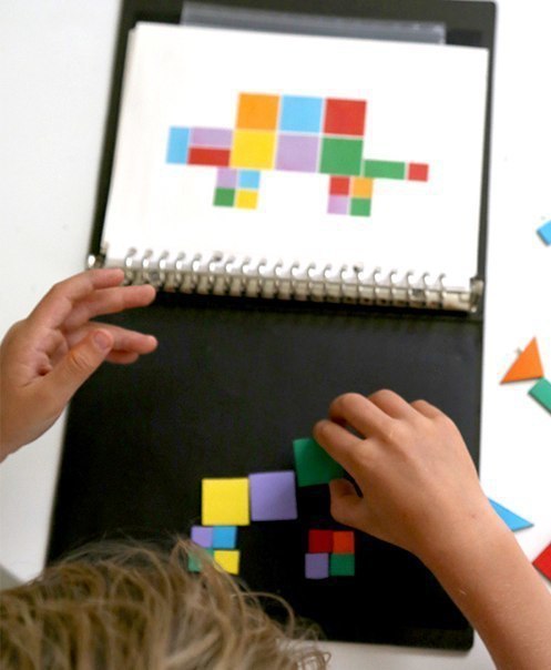 Превратите папку с файлами в место хранения такой мозаики, и проблем вообще не останется. Большой магнитный лист А4 приклейте к пластиковой обложке, с внутренней стороны, а второй лист нарежьте на полоски шириной примерно 2,5 см. Цветную самоклеящуюся бумагу приклейте к полоскам магнита и нарежьте такие подготовленные полоски на квадраты - по 4 квадрата каждого цвета. По одному квадрату каждого цвета оставьте как есть, другие квадраты разрежьте вдоль пополам, третьи - по диагонали, а четвертые - на 4 квадратика. Такой набор фигурок подходит под те шаблоны, что вы найдете в распечатках. Шаблоны вложите в прозрачные файлы и вставьте в папку, они послужат образцами для составления комплексных фигур.