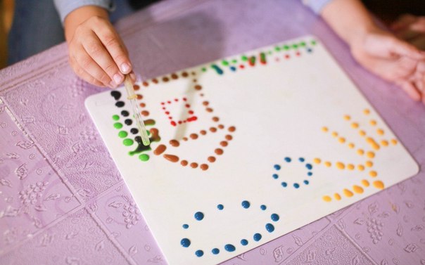 Основной принцип работы заключается в следующем: ребенок набирает пипеткой цветную воду и «рисует» капельками на пластиковой доске или бумаге.