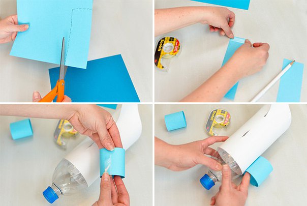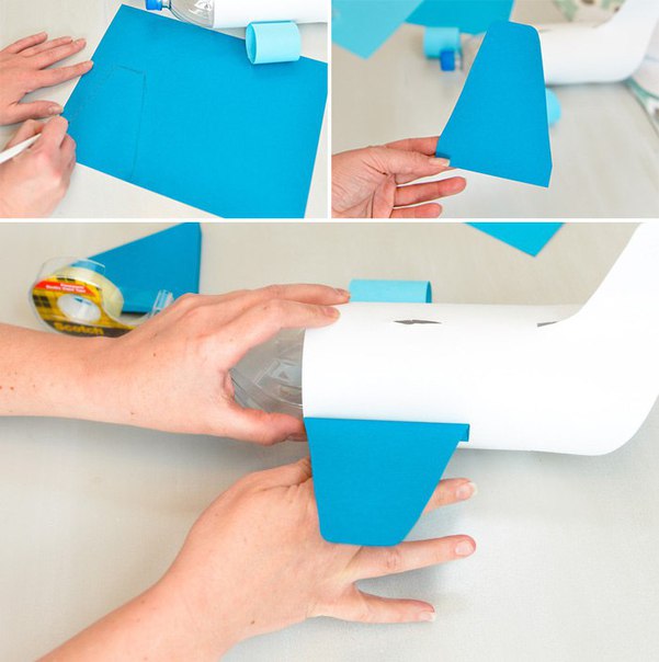 После этого приступим к двигателям, они у нас будут дополнительно выполнять роль ножек (подставок). Рисуем два одинаковых прямоугольника около 10 сантиметров в длину и 2-3 сантиметра шириной на цветной бумаге. Вырезаем, сворачиваем в трубочки склеиваем и закрепляем на нижней части корпуса, так чтобы конструкция могла ровно стоять на столе.
