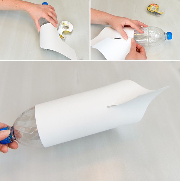 Двусторонний скотчем клеим обе части к бутылке. Тут главное не забыть вырезать отверстие для монет.
