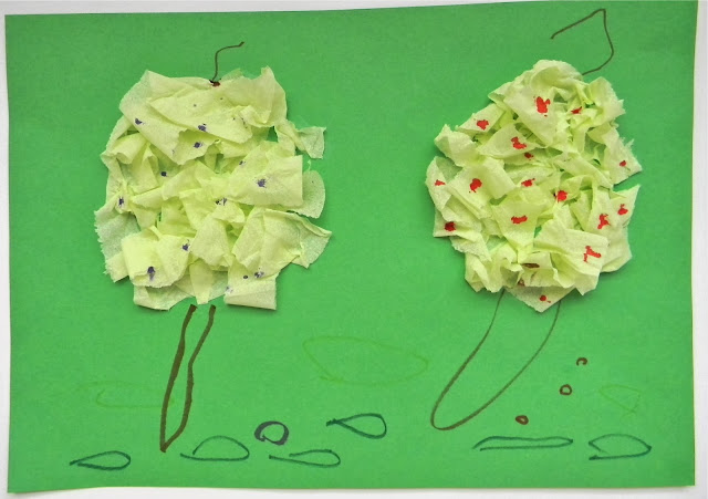 Для этой картины необходимо конфетти или мелко нарезанную бумагу. Мы использовали отходы от обычного дырокола). Рисуем краской или фломастером на бумаге стволы деревьев. Затем ребенок может сам нанести клей на место кроны и под деревом и посыпаем эти места бумажными кругляшками