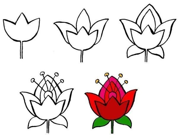 Объясните ребенку, что нужно начинать рисовать цветок с середины, затем лепестки и стебель с листочками. По окончанию рисунка приступайте к раскрашиванию. Покажите ребенку, как правильно закрашивать - нельзя, чтобы штрихи, либо краска выходили за контур изображения, иначе рисунок будет не аккуратным.