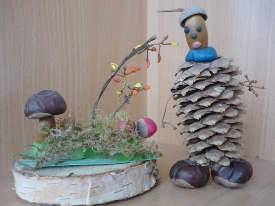 Материалы: еловая шишка (туловище) ; жёлудь (голова) ; каштаны (ноги) ; сухие веточки винограда (руки) ; шляпка жёлудя (шапочка Лесовичка).