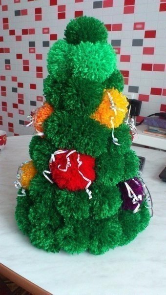 На полученный конус плотно друг к другу приклейте помпоны. Начните приклеивать от макушки, первый ряд состоит из 4 помпонов, каждый следующий ряд увеличивайте на 1-2.