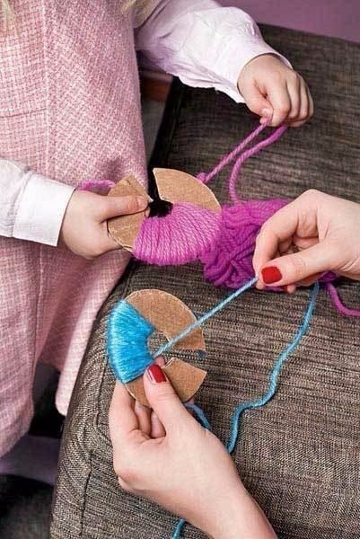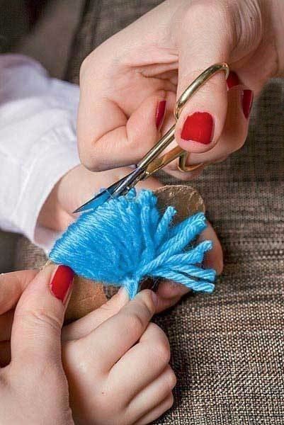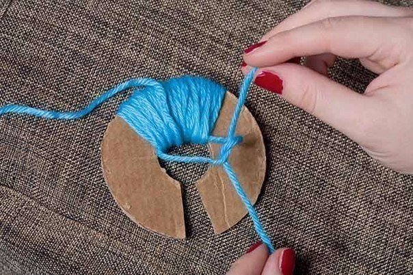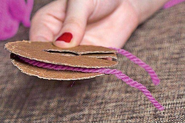 Вырежьте из плотного картона 2 диска, внешний радиус — 4 см, внутренний радиус — 1,5 см. Сложите диски вместе и намотайте на них нитку. Для одного помпона необходимо приблизительно 6 метров указанной пряжи. Намотанную нить разрежьте по внешнему радиусу дисков и внутрь, между дисками, вставьте новую нить, для затягивания получившегося множества кусочков. Нить туго стяните и диски выньте. Помпон готов.