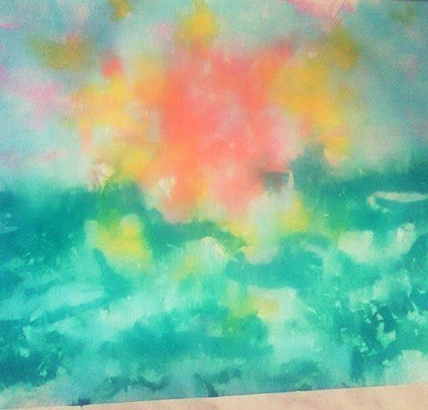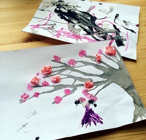 Намочите лист белой плотной бумаги. Разложите кусочки креповой бумаги, которые предварительно ребёнок порвал на кусочки. Снова обрызгайте бумагу водой.Снимите вилкой размокшую бумагу. Рисунок готов! Главное подобрать цветовую гамму. Можно и полянку с одуванчиками получить.