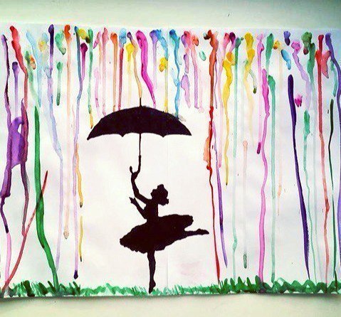 Балеринку с зонтиком нарисуйте или вырежьте по трафарету. Лист с девочкой поместите вертикально. Пусть ребёнок капает разведённой краской разных цветов сверху. Цвета пусть малыш выбирает по своему вкусу. Ждите, когда краска стечет и высохнет.