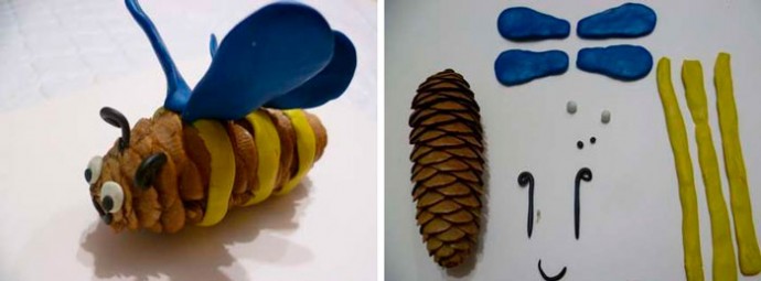 - Соберите пчелу таким образом: прикрепите полосы и крылья, шарики в качестве глаз, затем рожки и ротик.