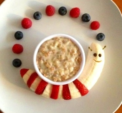 Из фруктов и ягод можно сделать с детьми 4-5 лет улитку, домиком которой будем небольшая плошка с кашей. Тело улитки делаем из банана. Его среднюю часть нарезаем кусочками и вставляем между ними кусочки клубники. Сверху выкладываем дугу из ягод.