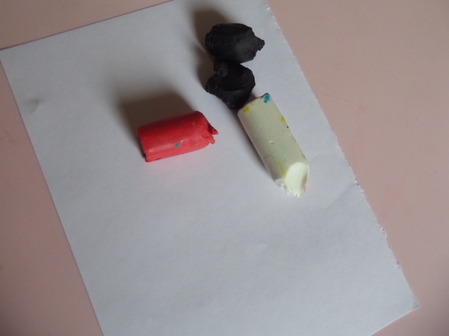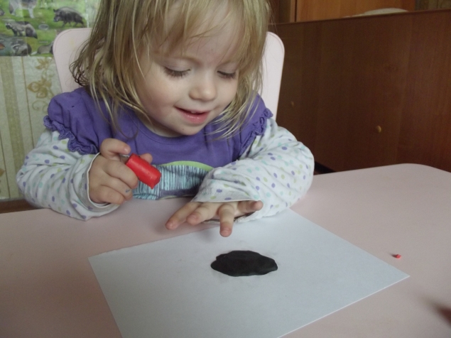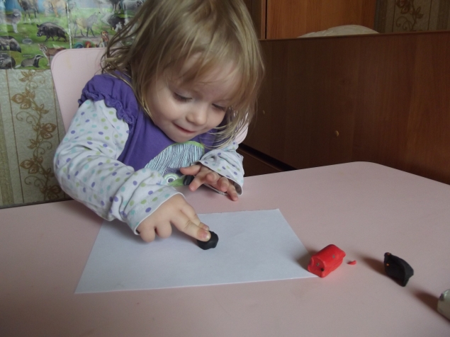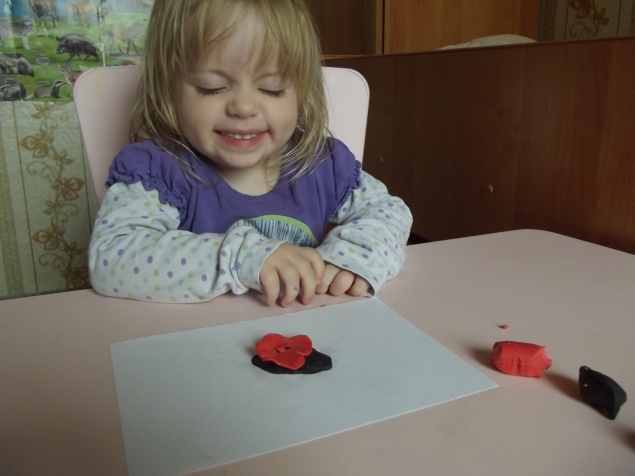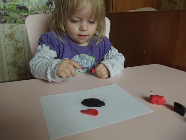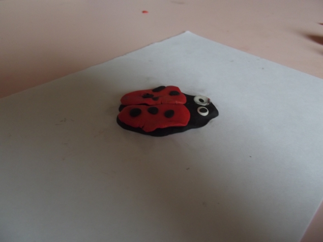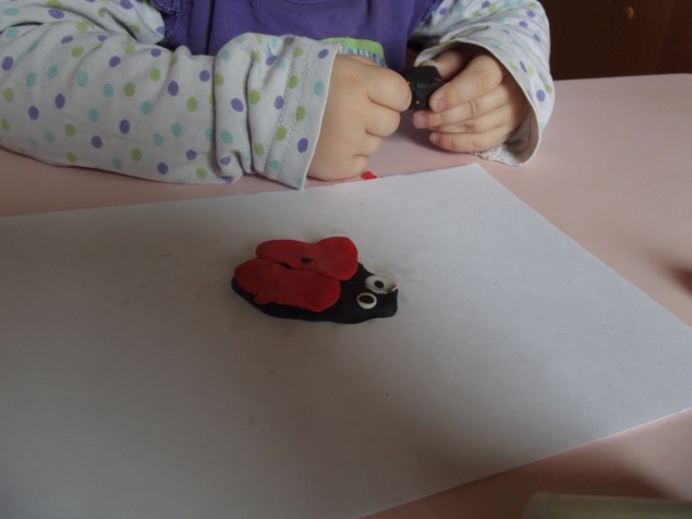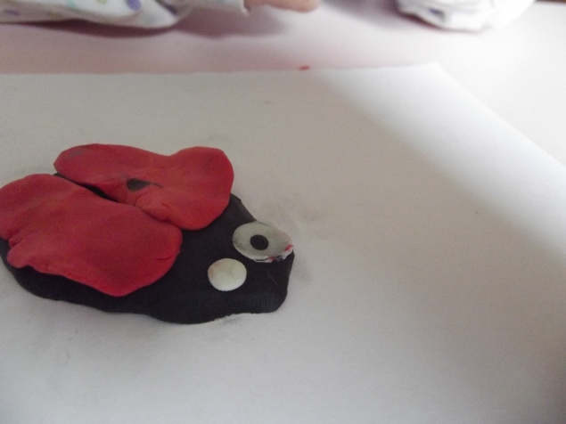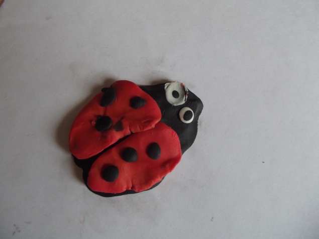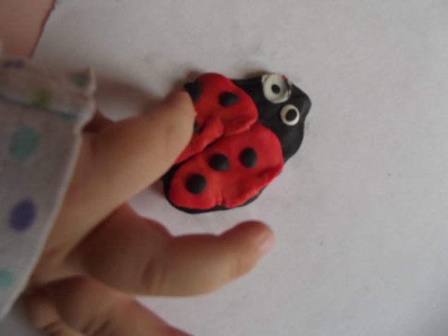 Для начала мы скатали шарики из пластилина черного и красного цвета и размяли их ладошкой в лепешку . Черная лепешка - туловище ,красную мы разделили пополам и получились крылышки . Еще по 2 шарика черного и белого цвета - глазки . А черные шарики - точечки . С помощью данной поделки мы повторили фигуру - круг . Просто , правда же ?
