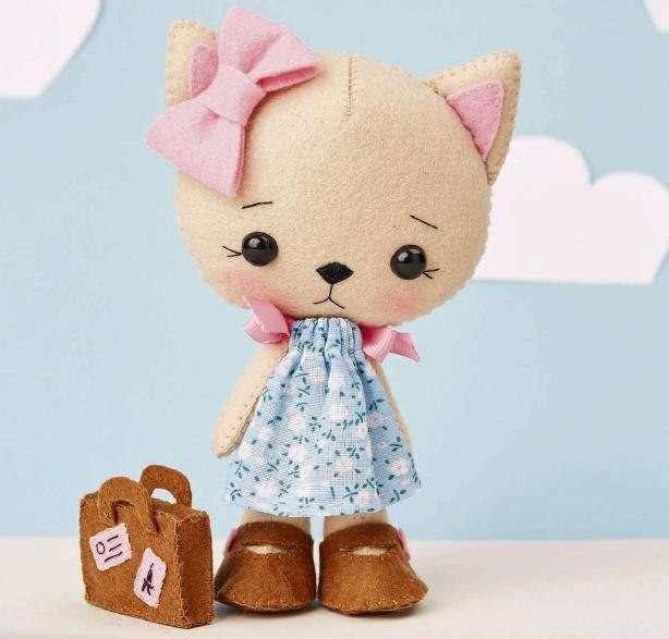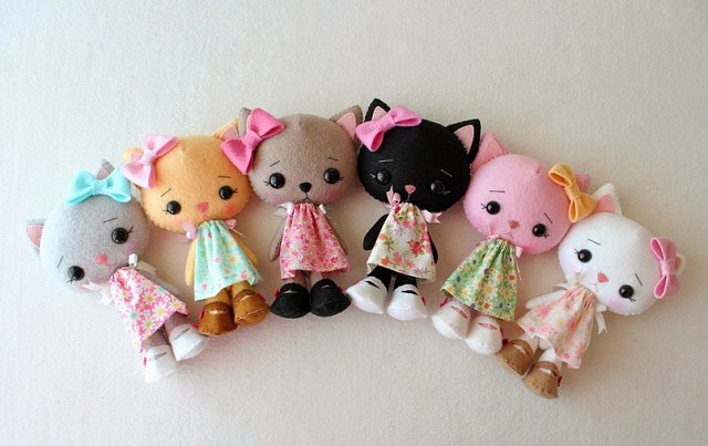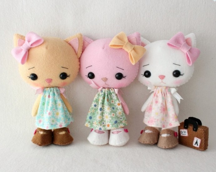 Очаровательные кошечки из фетра настолько просты, что даже ребенок сошьет такую кошечку небольшого размера довольно быстро.
