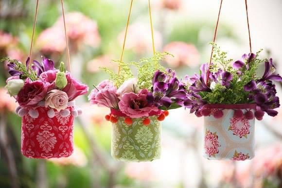 Простые вазочки из пластиковых бутылок и ткани отлично подойдут и для цветов, и для мелочей.