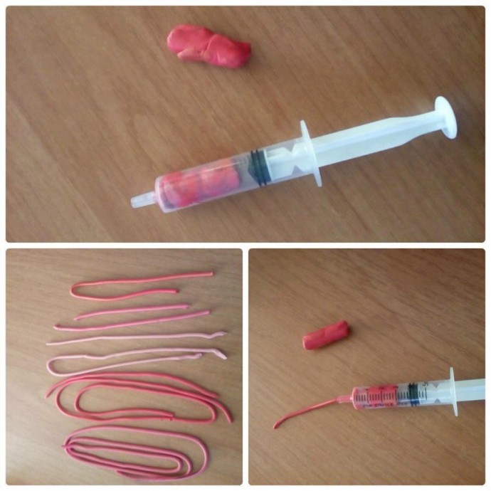 Далее поставить шприц в горячую воду, держать не слишком долго так как у пластилина есть свойство таять. Затем медленно выдавливаем пластилин на гладкую поверхность.