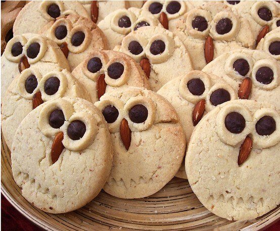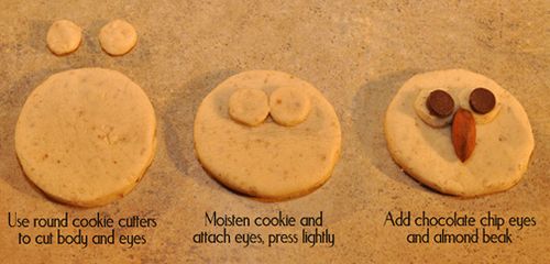 5. Накрыть противень пергаментной бумагой. Уложить на него заготовки для печенья, и перед тем как приклеивать к ним глаза и клюв смочить место для приклеивания. Налепить подглазники, сверху налепить на них зрачки (вдавить поглубже), а снизу клювы из половинок миндаля. Так же ножом можно вырезать лапки и крылья совам.