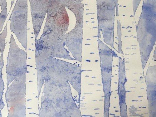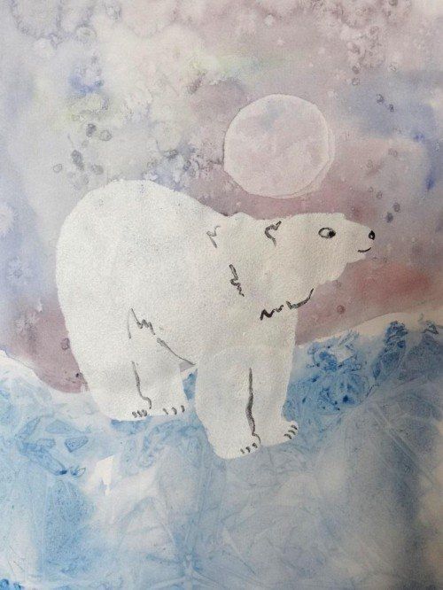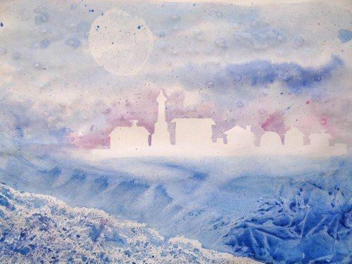 Удаляя сухой салфеткой с листа излишек воды и слой краски, можно нарисовать зимние ели, покрытые снегом, или пену морскую. Бледная луна или солнце получатся, если обернуть бумажной салфеткой тубус от туалетной бумаги и промокнуть акварельное небо. Даже уже высохший рисунок можно подправить, сбрызнув его водой и аккуратно потерев нужное место.