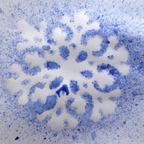 Посыпав на ещё влажный прокрашенный лист соль, можно добиться занятных эффектов. Средне-крупная соль при высыхании оставляет «снежинки» на синем. На зелёном фоне получится полупрозрачная листва. Мелкая соль-экстра засыхает практически намертво. Так можно добавить фактуры дороге, камню, создать галактику.