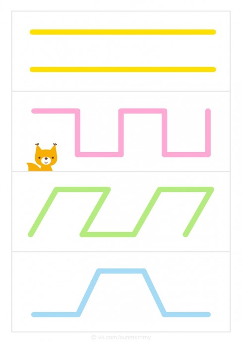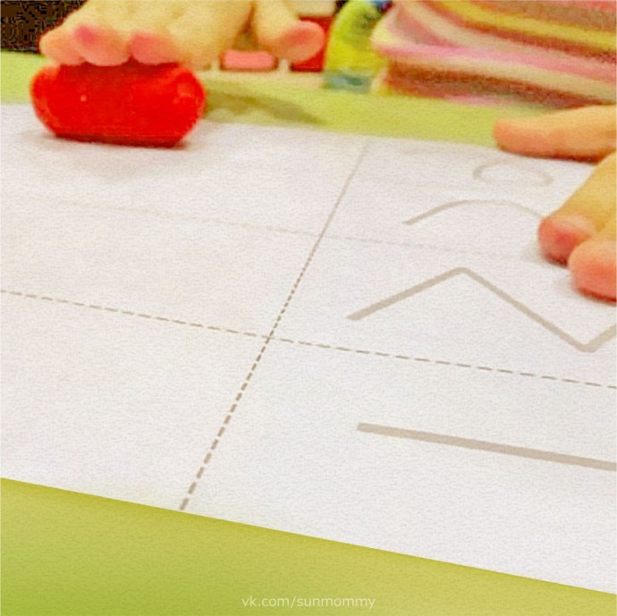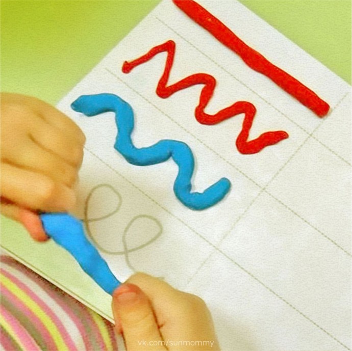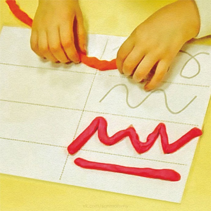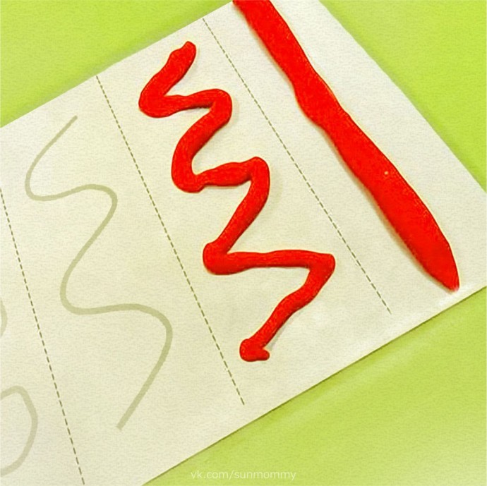 Распечатайте или нарисуйте кapточки по образцу. Затем нужно раскатать пластилин так, чтобы получились «змейки». Пусть ребёнок «повторит» из пластилина линии по контуру.