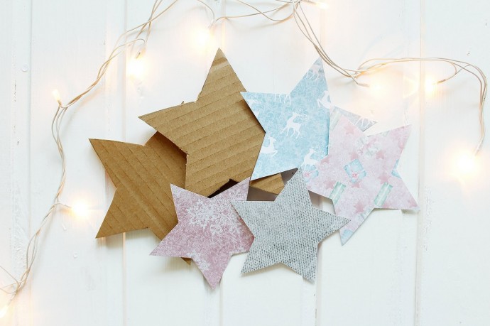 За основу звездочек возьмем гофрокартон. На подложки возьмем два листика - "Узоры" и "Падают снежинки".