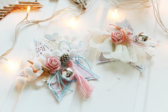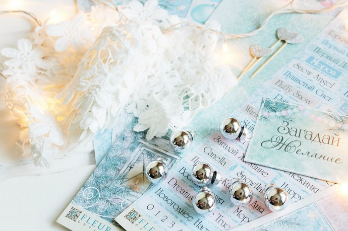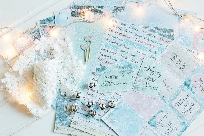 Приступим? Работать мы будем с потрясающей нежной новогодней коллекцией "Новогодняя сказка", так же нам понадобятся различные украшения - кружево, шарики, цветочки.