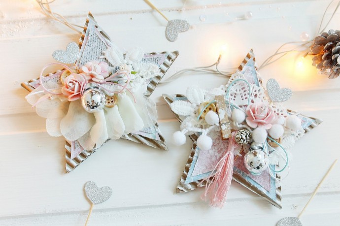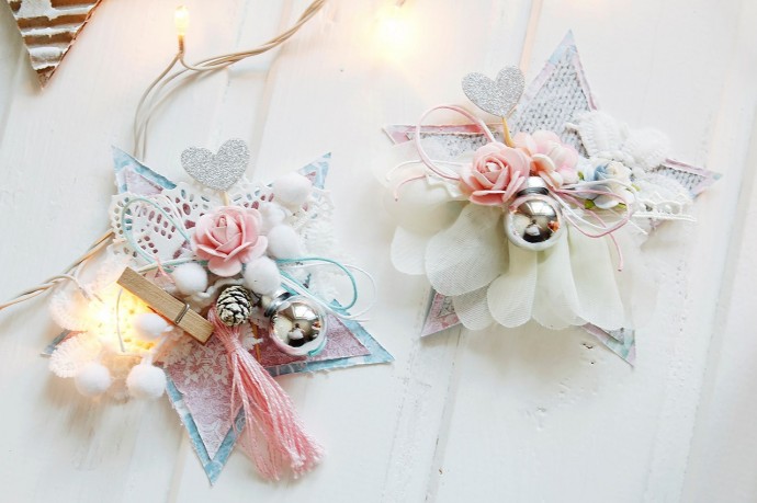 Раскладываем нашу новогоднюю композицию. Так как наши звездочки в стиле шебби, никуда без кружева и рюшей.