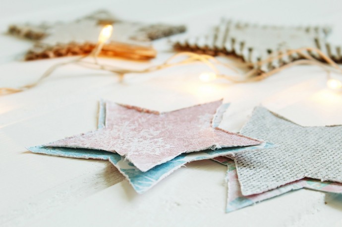 Сейчас мы будем декорировать наши звездочки. Берем наши заготовки звездочек из скрап бумаги, состариваем у каждой края и складываем друг с другом, на большую - меньшую.