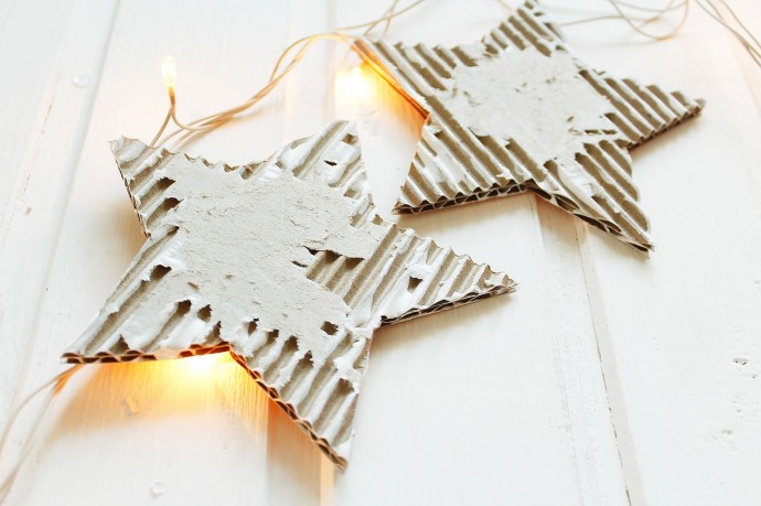С картона сдираем верхний слой, не обязательно весь, нам важны краешки. И затем смазываем их белым грунтом, имитируя снежок. Можно наносить краску пальцем. Оставляем сохнуть.