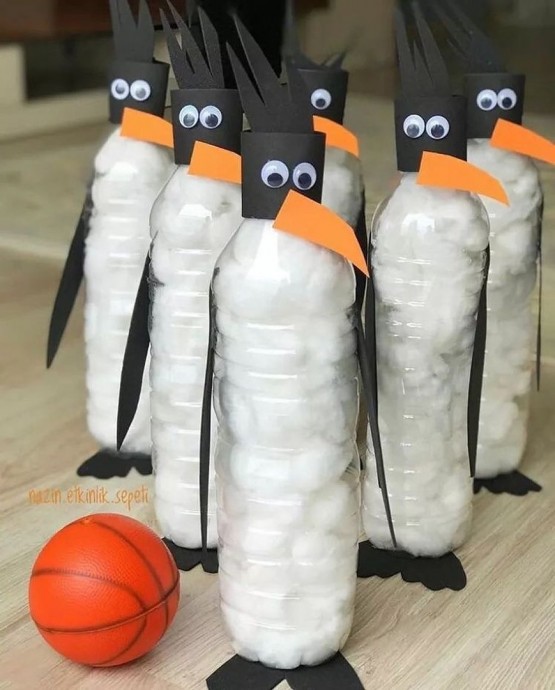 Наполняем бутылку ватой и приклеиваем голову с глазами и клювом, крылья и ласты.