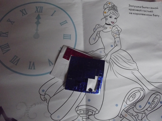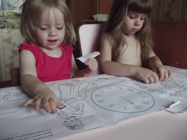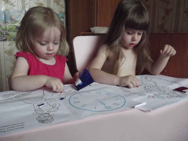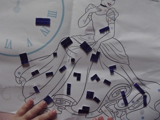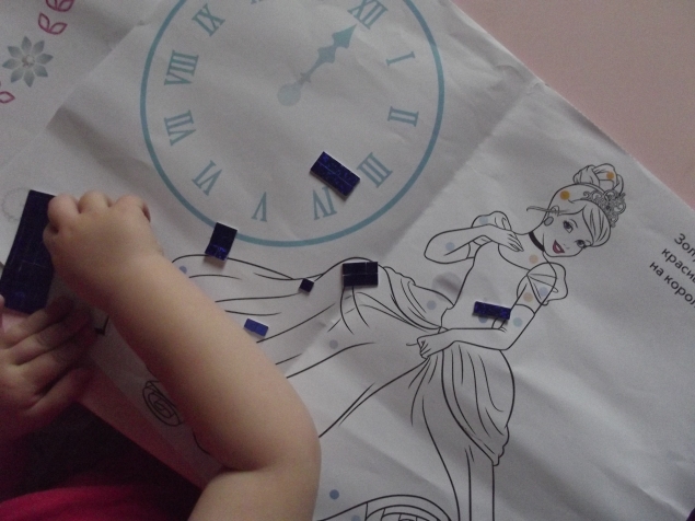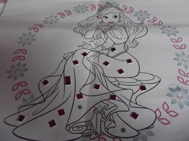 У нас остались стразы на клеевой основе и пара листов с изображением принцесс . Я предложила дочкам украсит их платья стразами .