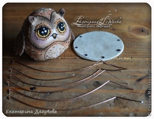 Очень симпатичная совушка, но несколько непонятных моментов в МК. На фото 6 элементов самого тела, а на самой совушке кажется, что она из 4-х клиньев. Для чего кружок с дырочками и проволока?
