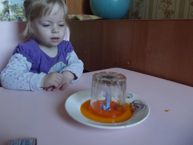 На тарелку крепите свечу с помощью пластилина . Наливаете немного воды . Для контраста , заранее ее подкрасьте . Зажигаете свечу и накрываете ее стаканом . Водя втянется внутрь стакана , за счет нагрева от свечи . Снимаете стакан , вода снова в тарелке .