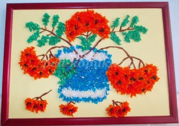 Коза в технике торцевания: часть 4 Коза в технике торцевания: часть 4 Авторы: Гановичева Софья, Гановичева Мария Анатольевна. Оформим работу еловыми веточками в технике квиллинг На полосу, отрезанную от салфетки нанесем клей. Скручиваем салфетку вокруг проволоки. Нарежем полоски из бумаги зеленого цвета. Нарежьте полоски тонкой соломкой не дорезая до края на 1 см. Наносите клей на неразрезанную часть полоски и клеите её обматывая вокруг проволоки. Затем соедините и приклейте все ветки вместе в углах квадрата основы. Вот и ... Коза в технике торцевания: часть 3 Коза в технике торцевания: часть 3 Авторы: Гановичева Софья, Гановичева Мария Анатольевна. Приклеим цветы на шею козе. Ту шерсть, которая в собственной тени на ножках выполним торцовками голубого цвета. Шерсть на животе и контур ног выполним торцовками фиолетового цвета. Предлагаю схему, чтобы уяснить места расположения фиолетовых торцовок. Добавим контур на крыльях фиолетового цвета. Дорисуем фон гуашью Используем оттенки голубого цвета и технику полусухой живописи. Это когда на кисть п... Коза в технике торцевания: часть 2 Коза в технике торцевания: часть 2 Авторы: Гановичева Софья, Гановичева Мария Анатольевна. Добавляю схемы, на которой показаны те участки, которые заполнять белыми торцовками. Волосы и перья на крыльях выполним торцовками голубого цвета. И схематично показываю участки, которые заполнять голубыми торцовками. Нос - торцовками розового цвета. На шее нашей козочки – ожерелье из трех цветов. Их мы сделаем из салфеток розового цвета. Разрежем одну салфетку на 4 равные части. Скрепим слои салфетк... Коза в технике торцевания: часть 1 Коза в технике торцевания: часть 1 Авторы: Гановичева Софья, Гановичева Мария Анатольевна. Начнем с того, что изобразим контур козы в мультяшном стиле на листе картона. Нарезаем салфетки на квадраты со стороной 1 см. Техника торцевания: Прикладываем к центру бумажного квадратика торец стержня от ручки. Накручиваем на стержень бумагу, прокатывая между пальцами. Получается цветная трубочка – торцовка. Намазываем клеем на картоне ту поверхность, которую хотим заклеить. Прислоняем к ней квад... Сердце в технике торцевания Сердце в технике торцевания Автор Галина Дедяева. Инструменты и оборудования для работы: 1. Пенопласт. 2. Нож. 3. Ткань красного цвета. 4. Ножницы. 5. Зубочистка. Процесс: При помощи ножа вырезаем объёмное сердечко из пенопласта. Покрасим нашу заготовку в красный цвет, используем акриловые краски. Из ткани нарезаем квадратики примерно 1,5см. на 1,5 см. Берём зубочистку и, свернув квадратик пополам вставляем его в пенопласт, протыкая его в глубь. Зубочистку убираем, а ткань остается. П... Панно в технике торцевания "Солнышко для мамы" Панно в технике торцевания "Солнышко для мамы" Торцевание — это вид бумажного творчества, который заключается в создании аппликативной мозаики из небольших кусочков гофрированной (креповой) бумаги. Технология торцевания заключается в следующем: Из гофрированной цветной бумаги вырезают небольшие квадратики. На середину квадратика ставят торцом стержень (карандаш или стержень от шариковой авторучки) и закручивают бумагу вокруг стержня. Получившуюся маленькую торцовку, не снимая со с... Рябиновый букет в технике торцевания Рябиновый букет в технике торцевания Автор: Ушакова Света. Вот такой букет ря