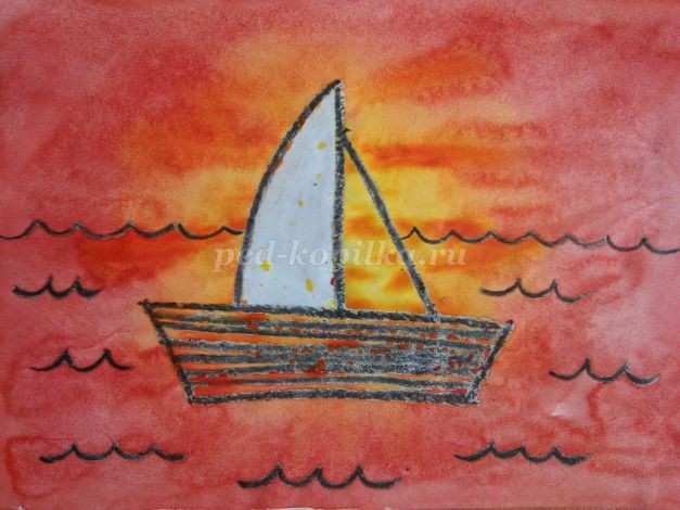 Кораблик из ракушек детскими руками Кораблик из ракушек детскими руками Авторы: Лыткин Артём, Терентьева Наталья Сергеевна. 1. Склеиваем два камня. 2. Приклеиваем зубочистку. 3. Приклеиваем ракушку к камням. 4. Делаем мачту и паруса. 5. Приклеиваем мачты. 6. Наматываем канаты. На концы зубочисток одеваем бусины. 7. Места склеивания маскируем бусинами. Обклеиваем камни ракушками, бусинами. Кораблик готов Кораблик на закате: часть 2 Кораблик на закате: часть 2 Автор: Виноградова Надежда Викторовна. Закрасить парус с левой стороны белым мелком Теперь рисуем море. Чёрным мелком рисуем волны, горизонтально деля волнистой линией лист примерно пополам Рисуем коротенькие волны ниже основной волнистой линии Теперь принимаемся за акварельный закат. В центре листа рисуем жёлтый круг Потом берём оранжевую краску и рисуем вокруг жёлтого круга так, чтобы на стыке цветов они перетекали друг в друга Берём красную краску и покрывае... Кораблик на закате: часть 1 Кораблик на закате: часть 1 Автор: Виноградова Надежда Викторовна. Материалы: Альбомный лист, белый и чёрный восковые мелки, акварель, широкая кисть. Ход работы: Рисуем контур кораблика чёрным мелком. Рисуем трапецию: днище - прямой линией, от неё наверх с двух сторон рисуем линии наверх как показано на фото Соединяем их концы прямой линией Нарисовать мачту: провести прямую линию примерно по центру верхней горизонтальной линии Нарисовать парус двумя линиями с двух сторон, как п... Море, корабль, солнце Море, корабль, солнце Сделайте надрезы и прогните бумагу наружу. Учимся рисовать транспорт: поэтапные уроки Учимся рисовать транспорт: поэтапные уроки Нарисуйте с детьми машины, поезд, корабль, велосипед, троллейбус, вертолет и даже подводную лодку. Кораблик в подарок папе: часть 2 Кораблик в подарок папе: часть 2 Автор: Гончарова Марина Михайловна Взять синий прямоугольник (3*8 см) и наклеить его от линии сгиба полукруга на белую часть. Наклеить два маленьких прямоугольника (1*2 см) от линии сгиба полукруга. Это трубы корабля. Взять второй синий прямоугольник, наклеить его поверх труб, совмещая стороны и углы, с наклеенным первым синим прямоугольником. Затем наклеить второй большой белый прямоугольник, закрывая часть синего. Наклеить 3 круга -иллюминатора. Наклеить к... Кораблик в подарок папе: часть 1 Кораблик в подарок папе: часть 1 Автор: Гончарова Марина Михайловна Для изготовления поделки необходимо приготовить: двустороннюю цветную бумагу, цветной картон, простой карандаш, линейку, ножницы, клей. Последовательность выполнения: Наша поделка кораблик выполнена из картона, представляет устойчивую конструкцию.Обвести форму круга на синем картоне или начертить циркулем круг диаметром 14 см. Вырезать его по контуру. Согнуть круг пополам – это основная деталь нашего корабля. Последов... Кораблик в подарок папе Кораблик в подарок папе Автор: Гончарова Марина Михайловна Для изготовления поделки необходимо приготовить: двустороннюю цветную бумагу, цветной картон, простой карандаш, линейку, ножницы, клей. Наша поделка кораблик выполнена из картона, представляет устойчивую конструкцию.Обвести форму круга на синем картоне или начертить циркулем круг диаметром 14 см. Вырезать его по контуру. Согнуть круг пополам – это основная деталь нашего корабля. Последовательно вырезаем все дополнительные детали.... Уч