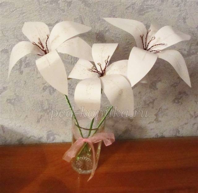 Лилия из бумаги: мастер-класс, часть 2 Лилия из бумаги: мастер-класс, часть 2 Автор: Иванова Вера Сократовна 6. Затем собираем лепестки. 7. Заготовку цветка накручиваем на стебелек, для этого используем деревянные палочки. 8. Стебель обкручиваем зеленой лентой и заклеиваем кончик 9. Лепестки лилии получаются очень гибкие и можно сформировать форму цветка какая понравится. Можно фломастером нарисовать точечки в середине каждого цветка. 10. Получившиеся лилии собираем в букет. Завязав нежной розовой ... Лилия из бумаги: мастер-класс, часть 1 Лилия из бумаги: мастер-класс, часть 1 Автор: Иванова Вера Сократовна Инструменты и материалы: картон, белый лист бумаги, проволока, деревянные палочки, бусины, зеленая атласная ленточка (узкая), розовая лента из органзы, клей, ножницы, карандаш и фломастеры. 1. Необходимо изготовить шаблон для лепестков. Лепестки лилии имеют продолговатую форму. 2. Обводим шаблон на белом листке бумаги. Должно получится 30 штук. Вырезаем. 3. Кладем кусочек проволоки между двумя лепестками и склеива... Букет из лилий из фольги детскими руками: часть 2 Букет из лилий из фольги детскими руками: часть 2 11. Достать карандаш. Получились «волнистые» тычинки. 12. Для прочности скрепить тычинки между собой ниткой. 13. Собрать цветок лилии. Взять 5 лепестков и 3-5 тычинок. Закрепить ниткой или полоской прозрачного скотча 14. Стебель цветка. Широкой полосой фольги обернуть карандаш (или любую другую палочку – для устойчивости стебля). 15. Плотно скручиваем стебель. 16. С помощью полосы фольги соединяем цветок со стеблем. 17. Цветок готов Часть 1... Букет из лилий из фольги детскими руками: часть 1 Букет из лилий из фольги детскими руками: часть 1 Автор Власова Ирина Тимофеевна. Для работы понадобятся материалы: рулон упаковочной пищевой алюминиевой фольги, линейка, карандаш, ножницы. Никакой специальной фольги для плетения не существует. Подойдет обычная «Саянская» фольга в рулоне марки «стандартная». Не надо брать для плетения «жаростойкую» или «особо прочную» фольгу, они слишком жесткие, и от работы с ними на нежных пальцах могут образоваться мозоли. Длина рулона не имеет значения. Обыч... Прекрасные лилии из цветной бумаги Прекрасные лилии из цветной бумаги Простая и красивая объёмная аппликация для детей. Обводим руку малышей и делаем букет из лилий Обводим руку малышей и делаем букет из лилий Такой букет отличная память о размере рук ребенка в разные периоды жизни. Лилии из гофрированной бумаги: мастер-класс Лилии из гофрированной бумаги: мастер-класс Такие цветы похожи на живые, и мама будет счастлива получить их в подарок. Лилия из ткани: мастер-класс Лилия из ткани: мастер-класс Автор: Анохина Ксения Для изготовления поделки нам необходимо: Плотная шелковая ткань белого цвета, зеленая лента шириной 4 см, ножницы, выжигатель по ткани, точилка для карандашей, зеленый, розовый карандаш, вата, поволока белого и зеленого цветов, желтая шерстяная нитка, клей, шаблон для листочков. Процесс: Вырезаем 3 лепестка А, 3 лепестка Б из ткани белого цвета и 5 листов из зеленой ленты. Точим зеленый и розовый карандаши. С помощью ваты окрашиваем лепе... Лилия из бумаги: мастер-класс Лилия из бумаги: мастер-класс Автор: Иванова Вера Сократовна Инструменты и материалы: картон, белый лист бумаги, проволока, деревянные палочки, бусины, зеленая атласная ленточка (узкая),