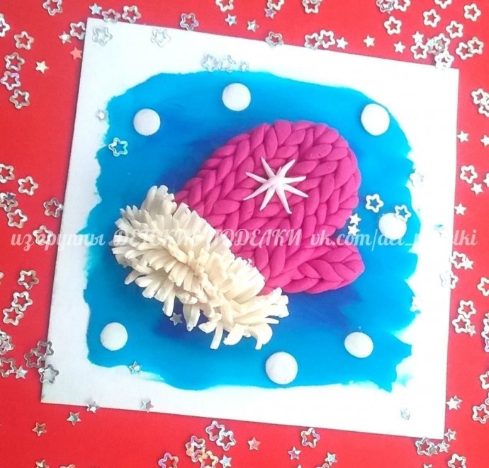 Зимние рукавички Зимние рукавички это аппликация с использованием ваты и шнура или пряжи.