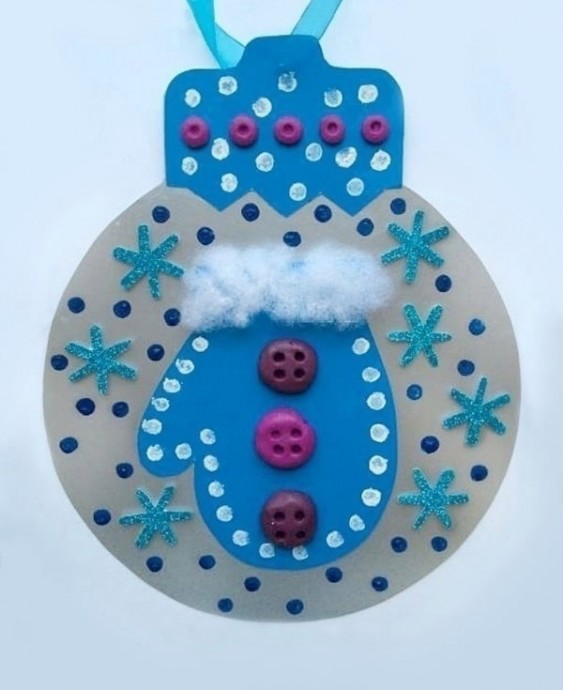 Волшебная рукавичка Вам понадобятся: шар, вырезанный из картона серебристого цвета верхняя часть шара, вырезанная из цветного картона рукавичка, вырезанная из цветного картона снежинки, вырезанные из блестящей бумаги (или готовые наклейки)  клей  гуашь  ватные палочки  пластилин  ручка  вата (или холофайбер)  ленточка Как делать: 1. Берем заготовку шара и приклеиваем на него верхнюю часть из цветного картона (любого цвета). Берем рукавичку и...